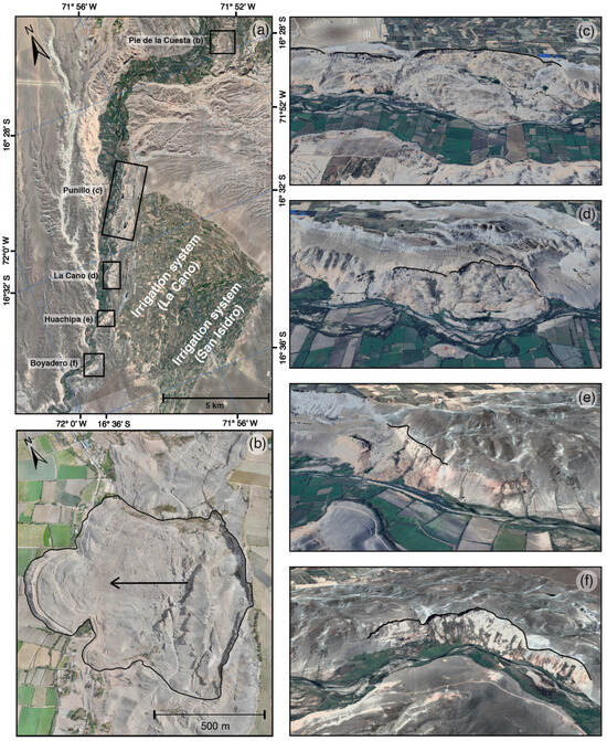 Google Earth images showing landslides in the Vitor Valley; black lines indicate landslides. (a) Geographical location of landslides in the valley and irrigation related to the landslides (b) Pie de la Cuesta Landslide, (c) Punillo Landslide, (d) La Cano Landslide, (e) Huachipa Landslide, (f) Boyadero Landslide.