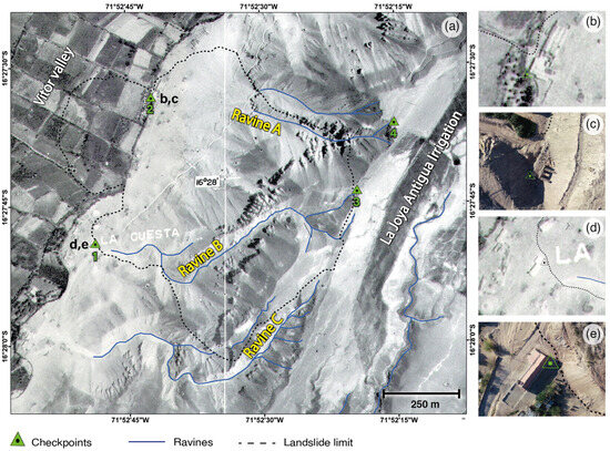 For a better understanding of the landslide’s development, an aerial photograph from 1945 and a satellite image obtained from Google Earth in 2015 were used. The digitized version of the 1945 aerial map, sourced from the National Aerial Photographic Service, was georeferenced to the WGS84 coordinate system used for photogrammetry-generated products (Figure 3). To perform this adjustment, four control points were used, obtained from old buildings and geomorphological characteristics, with a margin of error of approximately 14 m. (Table 2). From this photo, it is possible to see that the hillside, before being affected by the landslide, was divided by three main ravines and the agricultural activity in the pampas of Joya Antigua. Likewise, a correlation was made with a georeferenced orthomosaic from May 2019 and two satellite images from October 2015 and May 2023.