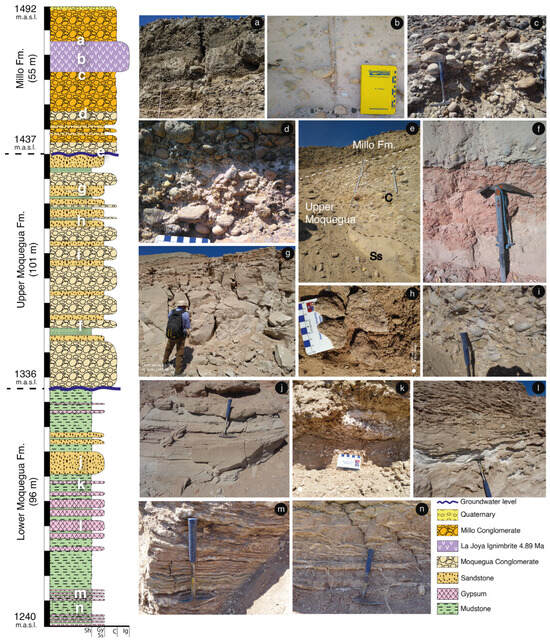 Synthetized stratigraphic log of different units cropping out in the study area. (a) Vertical cracks in the Millo Formation. (b) Ignimbrite with volcanic tuff clasts. (c) Conglomerates in a sandy matrix with 5 to 10 cm cobbles of intrusive and volcanic origin. (d) Level of carbonate precipitate indicating a paleo groundwater level (e) C Conglomerates of the Upper Moquegua Formation, overlying an Ss Sandstone layer. (f) Intercalation of sandstone and mudstone. (g) Fractured sandstone. (h) Medium-grained sandstone. (i) Polymictic conglomerates of the Upper Moquegua Formation. (j) Laminar sandstones. (k) Gypsum fragments within mudstone layers. (l) Centimeter-thick layers of massive gypsum. (m) Centimeter-thick layers of gypsum and red mudstones. (n) Gypsum in layers and as fracture fillings.