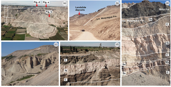 Field photographs showing (a) a panoramic view of Pie de la Cuesta landslide and locations of detail pictures (b,d,e); the stratigraphic sequence shown in Figure 4 is indicated by the white dashed line. (b) Southern limit of the landslide in contact with the sedimentary unit in the valley wall. (c) Erosional features in the conglomerates of the Upper Moquegua formation. (d) Outcrop on the main scarp of the landslide showing the top and base of the Millo formation, C conglomerate interbedded with Ignimbrite layer. (e) Outcrop of the Upper Moquegua Formation, showing interbedding of SS Sandstone, C Conglomerate and Ms Mudstone.