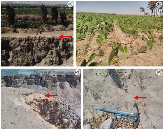 La Joya Antigua irrigation over Quaternary deposits. (a) A panoramic view of the head of the landslide showing Quaternary deposits. (b) Water channels for flood irrigation. (c) Quaternary deposits. (d) Eolian deposits. Red arrows indicate Quaternary deposits.