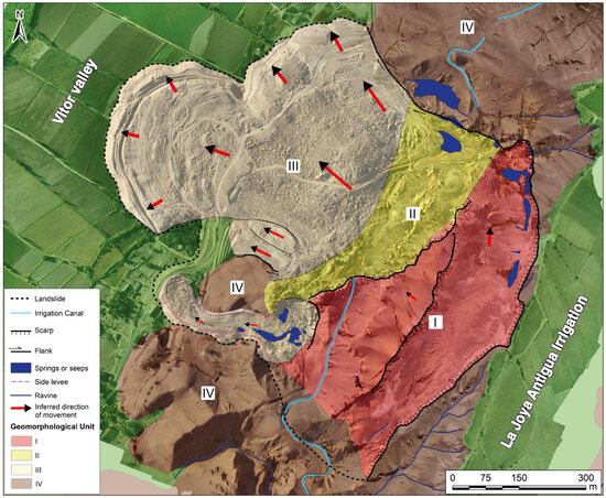While it is true that the landslide is initiated by the destabilization of the valley wall due to the development of a slope through erosion [19], this movement is also facilitated by water infiltrating from the Joya irrigation system (over 3500 hectares) where flood irrigation is practiced. The water first infiltrates through the soil, then through the Millo Formation and continues to the Upper Moquegua Formation. Up to two main groundwater levels have developed, surfacing at the head of the landslide.