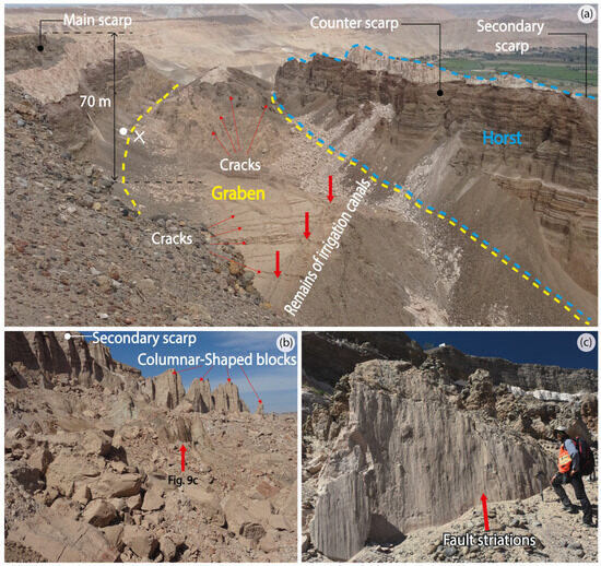 The horst has slid with primarily horizontal displacement and slight vertical movement (Figure 8a). The displacement is more pronounced on the NE side of the sliding block while maintaining the original stratigraphic configuration. Within the horst, there are north–south-trending cracks intersected by lesser-magnitude east–west-trending cracks.