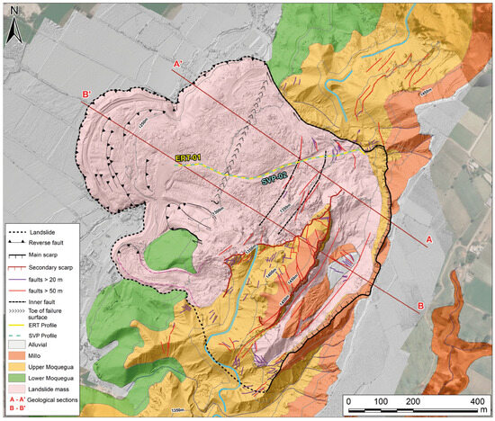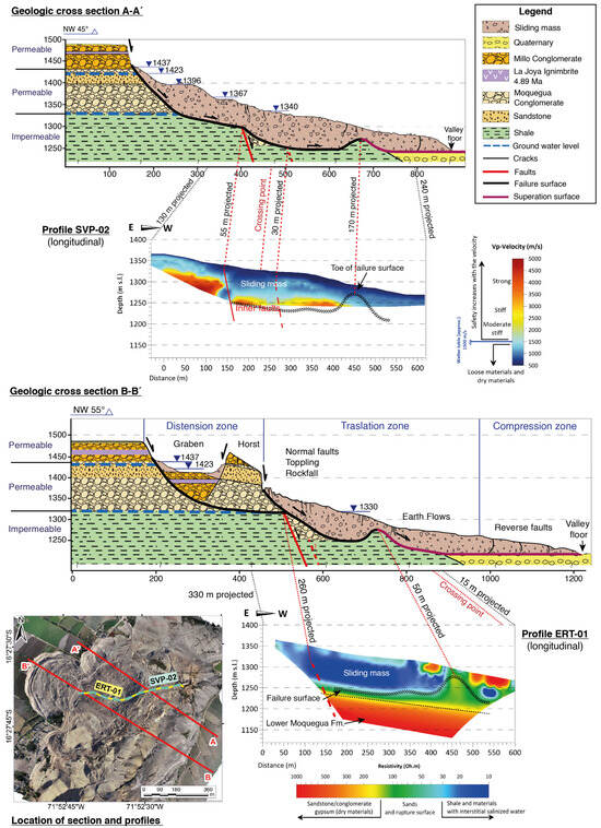 The geological cross-sections A-A’ and B-B’ (Figure 13) are constructed from the topography obtained from the 2019 orthomosaic, geological field observations in 2019 and two geophysical profiles from Electrical Resistivity Tomography (ERT-01) and seismic refraction (SVP-02), extracted from a previously published study [5]. Interpreting the cross-sections B-B’ (Figure 13), the upper part comprises the graben in which part of the soil has slid, along with its respective elevation with almost perpendicular fracturing to the sliding and affected at its southern end by normal faults, which attests to an initial sliding with a small rotational component. These two structural elements rest on a sub-horizontal sliding surface that joins the main sliding surface in the failure surface. This surface coincides with the contact between the Upper Moquegua (conglomerates) and the Lower Moquegua (red mudstones). The sliding surface follows the natural slope of the valley developed on the mudstones of the Lower Moquegua, as shown in Figure 13. Both sections illustrate inner faults that intersect the failure surface, which is also evidenced on the surface by the occurrence of normal faults. We refer to the area between inner faults such as the inflection zone, which has been delineated on the geological map (Figure 9).