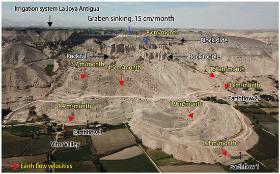 Gravitational landslides on valley walls are a relatively common geological process, contributing to the widening of valleys as rivers erode deeper into them. Landslides occurring on valley slopes due to the interplay of anthropogenic and geological factors represent an underlying issue in highly productive agricultural regions [9,10], leading to adverse social, economic and environmental consequences [11,12,13,14,15], particularly in areas with lithologies with poor geomechanics properties. Such is the case with the Pie de la Cuesta landslide in the Vitor Valley, Arequipa [5,16].
