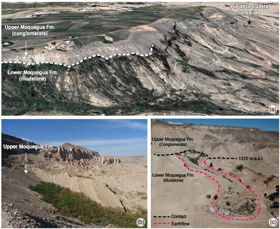 The stratigraphic units exposed in the study area range in age from the Eocene to the Quaternary period. These units correspond to the formations of Lower Moquegua, Upper Moquegua, Millo, Pleistocene alluvial deposits, Holocene terrace alluvial deposits and recent fluvial deposits [28,29]. Additionally, there are colluvial–deluvial deposits originating from landslides.