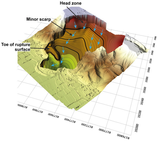 Failure surface under Digital Terrain Elevation model. The arrows indicate preferred groundwater flow directions. Modified from Huayllazo et al. [5].