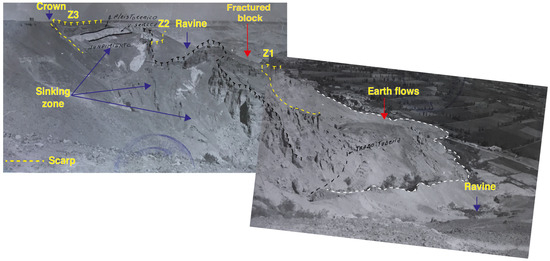 While Figure 3 shows the complex geomorphology of the terrain in the study area before being affected by the landslide in 1945, Figure 14 shows the state of the landslide two years after the main collapse that occurred in 1975 [19]. Source areas or contributory zones of the landslide are labeled in this figure. Zone Z1 shows the earth flows’ source area, and a fractured block can also be observed, which would be the material that currently forms the earth flows covering the agricultural areas at the bottom of the valley. Additionally, zone Z2 is delineated, which is currently the secondary scarp of the landslide and part of the earth flows’ source area. Consequently, zone Z3 is the main scarp of the landslide and could potentially become the main source area in the future when an external factor triggers a collapse of the horst structure, which is currently fractured in transverse and parallel directions to the direction of the landslide, as shown in Figure 9.