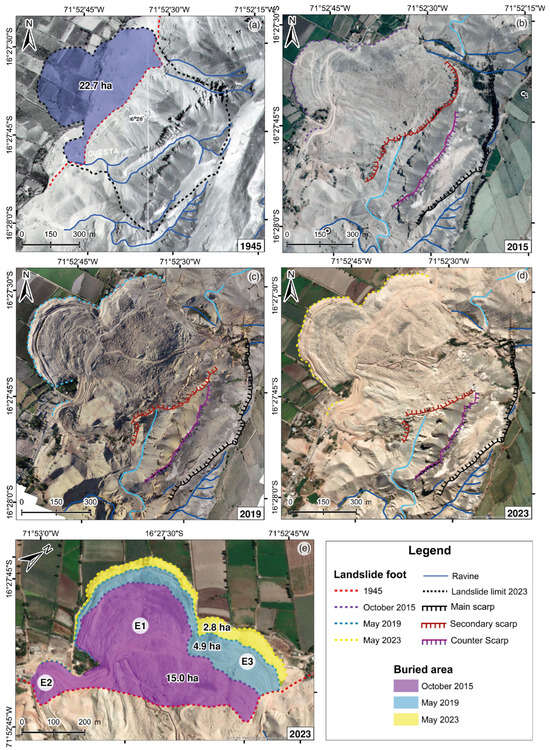 (a) Multitemporal evolution of the landslide by comparing geomorphological characteristics from aerial photos (a,c) and satellite images (b,d,e). (a) Aerial photo from 1945 showing the position of the foot of the slope in 1945 (red dashed line) and the landslide boundary in May 2023. The blue polygon indicates the total buried area. (b) Google Earth satellite image from October 2015 showing the position of the foot of the landslide mass before reactivation. (c) Aerial photo from 2019 showing the position of the foot of the landslide mass after reactivation. (d) Google Earth satellite image from May 2023. (e) Position of the foot of the landslide, represented by dashed lines (2015–2023); the buried areas delimited at different time intervals are also shown.