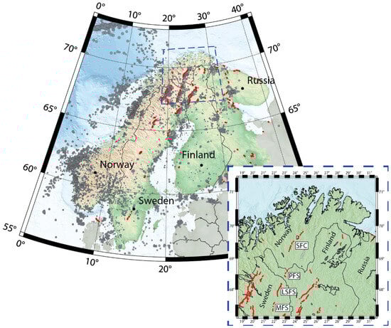 PGFs with very clear surface expressions can be found in at least 14 localities around Fennoscandia (red lines in Figure 1), including northern Finland, Sweden, and Norway [41,42,43]. These faults are the only confirmed and well-characterized at the km scale in the world [4,42,44], ranging between 2 and 160 km long with vertical displacements of up to 30 m [41]. The largest are the Pärvie (Sweden) and the Stuoragurra (Norway) faults [4]. Additionally, a set of shorter GIFs—but still seismically active—can be found spread in the region between latitudes 64° and 70° N, as Palojärvi (Finland) [45,46], Lainio–Suijavaara (Sweden) [7,42,47], and Merasjärvi (Sweden) [7,9,42,47]. They generally strike SW-NE, and they are commonly interpreted as thrust faults. Our study was focused on four postglacial fault systems: the Maze and Iešjávri, the Palojärvi, the Lainio–Suijavaara, and the Merasjärvi.