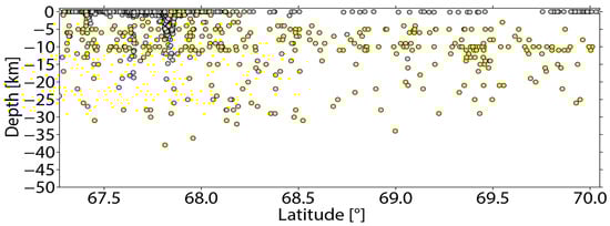 The natural earthquakes in the official catalogs are low-magnitude and cortical, most of them near faults extending from the SFC to the MFS, and located up to 30 km deep (yellow dots in Figure 3). Mining earthquakes are shallow, most of them located at the near-surface (gray dots in Figure 3).