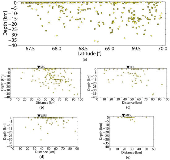 Seismicity along vertical profiles shown in Figure 4: (a) north–south distribution of seismicity along the PGFs, (b–e) vertical sections: Stuoragurra fault complex and Palojärvi, Lainio–Suijavaara, and Merasjärvi fault systems.