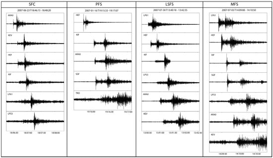 Examples of earthquake waveforms for each PGF. From left to right, SFC: Stuoragurra fault complex; PFS: Palojärvi fault system; LSFS: Lainio–Suijavaara fault system; MFS: Merasjärvi fault system. Figure shows the vertical component waveforms recorded at each station.