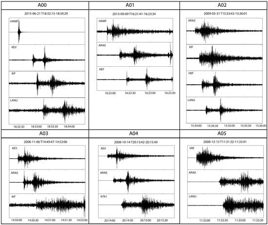 Mining activities can generate a variety of seismic signals, both intentional and unintentional, due to the mechanical and explosive processes involved [90,91]. This type of seismicity accounts for a significant portion of the seismic signals recorded in Norway, Finland, and Sweden, largely exceeding tectonic events in both frequency and magnitude [53,54,55]. The seismic waveforms generated by mining activities typically have distinct characteristics that allow them to be distinguished from tectonic events. In our manual review process, we observed that the waveforms from mining events exhibited consistent patterns across different mining zones, regardless of the source location. Figure 7 shows a representative waveform example from each mining zone to illustrate the similarities in signal patterns that led to these reclassifications. This consistency was a key criterion for identifying and reclassifying several events as mining-related in our revised catalog.