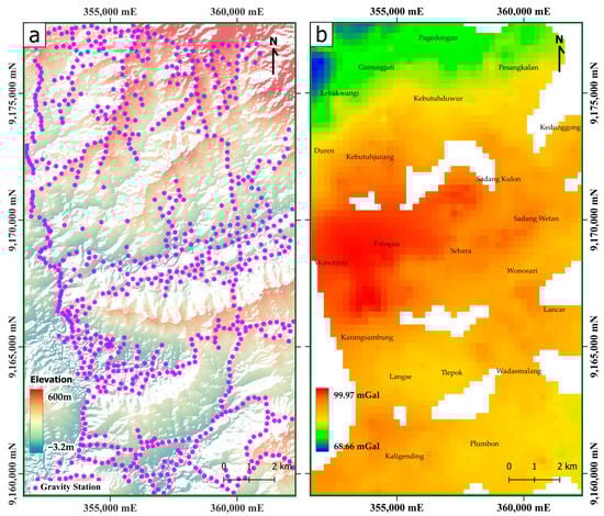 A land gravity survey was conducted from July 2018 to October 2019 to measure gravity anomalies in the study area. A total of 818 gravity data points were measured, covering a 10 × 18.8 km2 area in Karangsambung, with station spacing of approximately 250 m. The distribution of gravity stations is shown in Figure 3a. The measurement was carried out using Scintrex CG-5 Autograv (Scintrex Limited, Concord, ON, Canada). Following standard procedures, the gravimeter was calibrated and stabilized at least three days prior to measurement in order to ensure the accuracy of the gravity data. The survey also adopted a looping method to compute daily instrumental drift. At each station, at least three consecutive gravity readings were recorded, with a maximum deviation of 10 µGal among them. The positioning of each gravity station was recorded using two RTK-GPS (D-GPS) units.