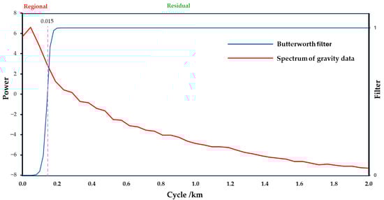The radially averaged power spectrum of the gravity data. The red line represents the spectrum signal, while the blue line illustrates the design of the Butterworth filter, which has a cutoff wavenumber of 0.15 cycles/km (purple dashed line) and a filter order of 8. The high-pass filter attenuates longer wavelengths, producing residual anomalies that reveal shallow geological features of interest.