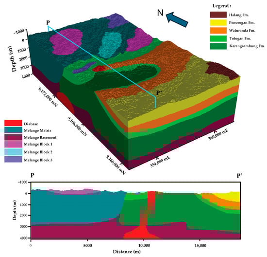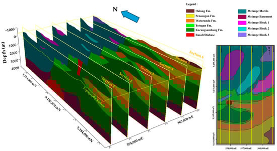 In addition, the Tertiary sedimentary rocks, predominantly distributed in the southern areas, were modeled as layered rock formations with two opposing dip directions, resulting in the formation of an anticline structure. Near the surface, the horizons and thicknesses of each formation in the model were varied according to the geological cross-sections from Asikin et al. [] and further refined through the fitting and comparison process during the construction of the final a priori model. The final 3D a priori model is presented in Figure 9.