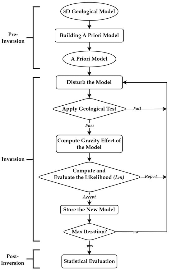 The 3D stochastic inverse modeling was carried out using Geomodeller software (version 4.0.8), employing a Monte Carlo sampling approach to explore possible solutions. This method allows for the incorporation of multiple geological constraints during the inversion process. These constraints are necessary to mitigate the non-uniqueness of gravity inversion results, especially in the absence of borehole data. The inversion strategy and procedures described by Guillen et al. [] are summarized below, and the simplified workflow of the inversion process is illustrated in Figure 6.