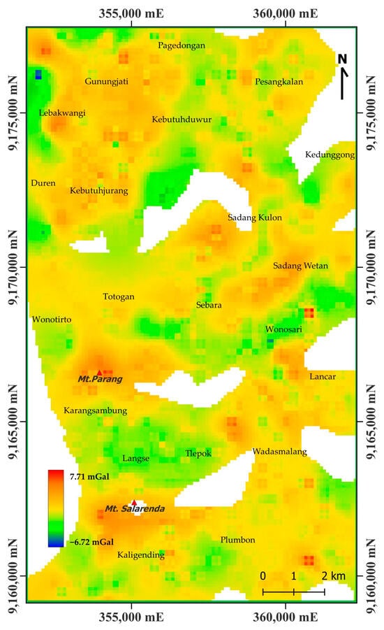 All measured gravity data were corrected using standard gravity corrections [] to obtain the observed anomaly. Tidal correction was automatically applied using the Longman [] equation, which is integrated into the gravimeter. Instrumental drift was calculated manually, assuming linear drift during each looping survey. Bouguer corrections were applied to account for the gravitational attraction of the mass between the observation point and the reference level, yielding simple Bouguer Anomalies. The final correction, applied to obtain Complete Bouguer Anomalies (CBA), was the terrain correction. The terrain correction was calculated automatically and simultaneously by the computer using an exact formula for rectangular prisms [,]. To achieve this, the topography surrounding each station was discretized into several zones of prisms with increasing radii, extending up to 166.7 km. The gravity attraction of each prism was then calculated for each station. Each zone was associated with a different Digital Elevation Model (DEM) cell size, depending on the distance from the station. A detailed DEM with a resolution of 0.27 arcseconds (equivalent to 8 m), obtained from the Indonesian Geospatial and Informatic Department (BIG), was used to compute the inner terrain correction within 1 km of each station. Additionally, the regional terrain correction up to 166.7 km was computed using digital elevation data derived from SRTM30 DEM, downloaded from USGS. A reference density of 2.61 g/cm3, comparable with the average density of the surface rock sample (Table 1) was used in Bouguer and terrain correction. In addition, the kriging method with a radius of 250 m was employed to interpolate unavailable data in the surrounding area and to construct the Complete Bouguer Anomaly map (Figure 3b). The Complete Bouguer Anomaly ranges from 68.66 mGal to 99.97 mGal. The blank area represents regions outside the measurement area, generated during interpolation to prevent extrapolation of the data. The strongest gravity anomalies were observed near Mt. Parang, Wonotirto, and Totogan, while the weakest gravity anomalies were primarily observed in the upper region.