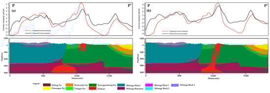 The results of the iterative trial-and-error process for 2D forward modeling along the P–P’ profile for two proposed database models: the block-in-matrix model (a) and the intrusive model (b). The red line represents the calculated anomaly, while the black line shows the observed anomaly.