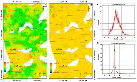 The misfit distribution between observed gravity and the forward a priori model (a) and between observed gravity and the forward inverted model (b). Reddish areas indicate regions with high positive misfit, while bluish areas indicate regions with high negative misfit. The histograms show a decrease in average misfit values from −2.18 mGal in the initial forward model (c) to −0.0068 mGal in the inverted model (d), demonstrating the effectiveness of the inversion process. The red triangle denotes the location of the mountains.
