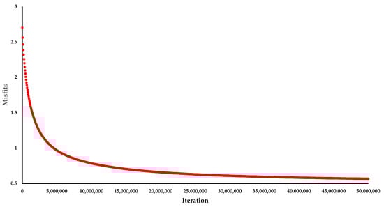 The inversion performance, shown in Figure 11, demonstrates a decrease in misfit as iterations increase, ultimately achieving a final RMSE of 0.55 mGal after 50 million iterations. This suggests that the inversion process successfully minimized the misfit by approximately 80% relative to the a priori model. This result is further supported by the reduction in the average misfit, as shown in the histogram, from −2.18 mGal before inversion to −0.0068 mGal afterward. Although additional inversion iterations were attempted to further reduce the misfit, these efforts increased processing time and produced results increasingly inconsistent with geological concepts. This discrepancy arises because the misfit error is exceptionally high in areas with extreme gravity anomalies, making it challenging to achieve low misfits in those regions during the inversion process.