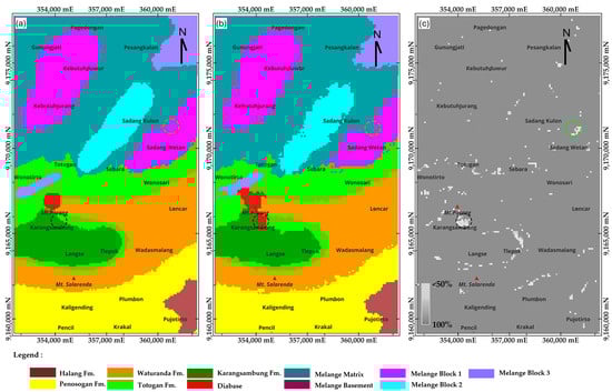 The top surface of the 3D a priori model represents the lithological distribution in Karangsambung (a). The top surface of the inverted model shows changes in the lithological interface after inversion (b). Notable changes on the surface of the inverted model, compared to the a priori model, are particularly evident in Sadang Wetan and Mt. Parang, highlighted by green and black dashed circles, respectively. The percentage probability values in (c) indicate the uncertainty and confidence levels of the perturbed model after inversion, with low and high probability values represented by white and gray, respectively. The red triangle denotes the location of the mountains.