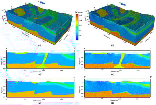The 3D discrete a priori model serves as a starting model in the inversion (a). The inverted model, which reflects the new density distribution in the 3D model, is shown in (b). The colors indicate the contrast densities assigned to each cell, with the red-to-blue color bar representing high to low contrast densities. A background density of 2.61 g/cm3 was used in the modeling. Comparisons between the a priori model and the inverted model along the P–P’ section are shown in (c,d), and along the U–U’ section in (e,f). Along P–P’, a decrease in the volume of the Waturanda Formation, compared to the a priori model, is highlighted by the red dashed line. Detailed changes in each lithology are presented in Table 1.