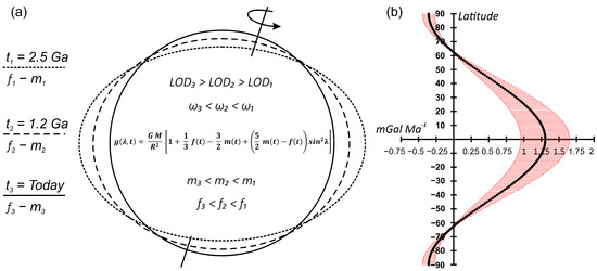 Assuming that Earth’s mass (M) is constant as of 2.5 Ga ago and maintaining the aforementioned assumption of constant R in the same time span, the estimated f and m values allow for estimates of past g(λ, t), and more importantly, for a Δg(λ) rate in the past 2.5 Ga (Figure 1b) using Equations (1) and (2); see Section 1 in the main text.