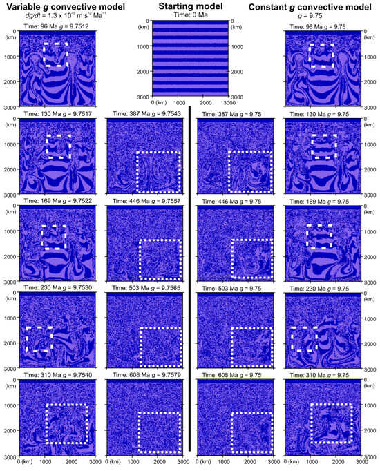 Mantle convection models with (panels to the left of the bold black line) and without gravity increase (panels to the right of the bold black line). The modeling was assumed to start from 2.5 Ga ago (equatorial gravity 9.75 m s−2). Reading of the figure should be performed symmetrically with respect to the vertical black bold line and according to the time elapsed from model start that is recalled on top of each model. Dashed polygons support the visual comparison between models with and without gravity increase at each time step. Horizontal layering (blue or violet particles) does not represent compositional variations but only deformation status in comparison with the horizontal stratification in the starting model (upper central panel). Areas with homogeneous color patches locate sections where the ongoing convection induced less deformation. The only change between the input parameters of the two models is given by the gravity increase rate (dg/dt) of 1.3 × 10−5 m s−2 Ma−1 included in the left models.