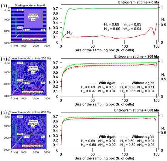 (a) Directional entrograms for the initial state at time zero. (b) Directional entrograms after 200 Ma of convection where entropies are calculated both with (continuous lines) and without gravity change (dashed lines). (c) is the same as (b) but computed at 608 Ma. Convective models on the left part of each figure correspond to variable g convective models shown in Figure 2. Color codes of the entrograms correspond to horizontal (red lines) and vertical (green lines) sampling directions. The entropy of the smallest sampling box HL0 and the entropy of the entire system H0 are provided for each entrogram. HL denotes the local entropy of the sampling box while HR denotes the relative entropy of each sample (HL = HR/H0). The normalized entropic scales along the horizontal and vertical sampling directions are also provided for each plot—i.e., nHSX and nHSY, respectively.