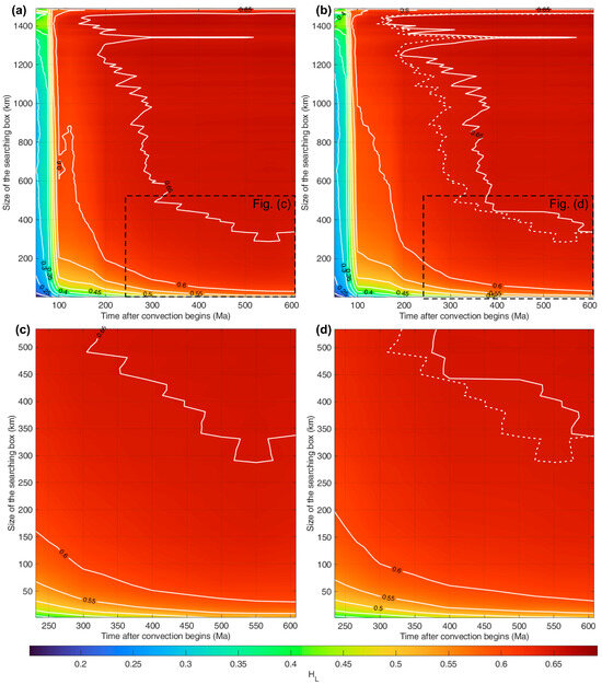 The color variation parallel to the abscissa depicts the temporal evolution of the Shannon entropy of a given searching box along the horizontal direction, while a color variation parallel to the ordinate depicts the spatial distribution of the Shannon entropy at a given epoch after the convective model has started. For example, the plot shows that in a searching box of 1000 km size, HL reaches 0.65~400 Ma after convection starts if gravity is kept constant, while it reaches the same Shannon entropy ~100 Ma earlier if gravity increase is considered (Figure 4a,b). Furthermore, the minimum size of a searching box with the highest entropy is somehow representative of the lateral spreading of the entropy increase due to mixing: the smaller the size of this searching box, the more widespread the entropy increase. For example, at 500 Ma, the Shannon entropy is ≥0.65 for all searching boxes > 440 km if gravity increase is not considered (Figure 4d), but this spatial threshold decreases by ~100 km (entropy increase is more widespread) if the gravity increase is accounted for (Figure 4c).