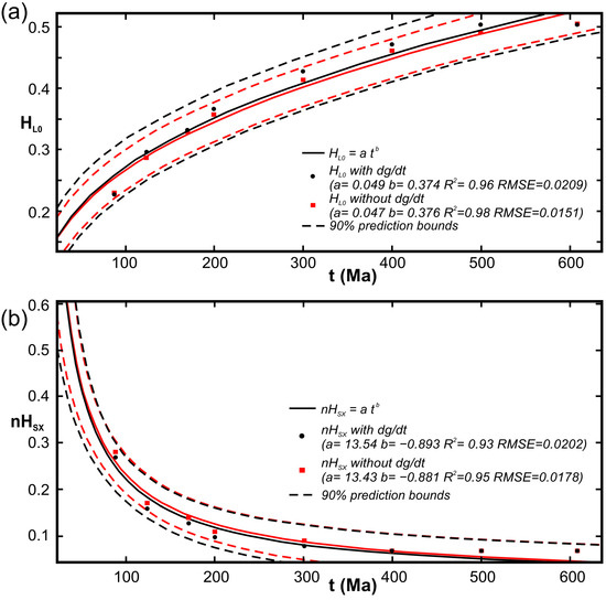 (a) Temporal increase in the entropy of the smallest element included in the convective system (HL0)—i.e., the 10 km × 10 km cell. (b) Temporal decreaseof the normalized entropic scale along the horizontal direction (nHSX)—i.e., the order along the x direction. Plots consider both the model accounting for dg/dt (black data and fitting curves) and the model neglecting such variation (red data and fitting curves). Fitting coefficients and goodness parameters are provided within each plot. Dashed lines represent 90% confidence prediction bounds for the proposed fits.