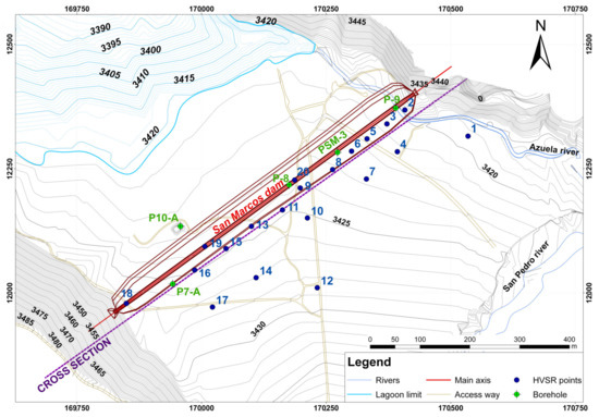 In the natural lagoon of San Marcos, Cayambe Canton (Pichincha Province of Ecuador), a loose materials dam has been built and put into operation as a water reservoir for irrigation and drinking water. In this area, various investigations have been carried out, both for the construction and about natural hazards, by the owner of the infrastructure, the Decentralized Autonomous Government of the Province of Pichincha (from now on referred to as GADPP, the Spanish abbreviation of the Institution) [7]. In 2018, Torres [8] studied and defined the hazards related to volcanism and seismicity for said dam, evidencing the acceleration of the terrain on which the dam is founded and the possible effects of an eruption of the nearby Cayambe volcano. Subsequently, Alonso-Pandavenes et al. [9] carried out investigations on the axis and foot of the dam in order to determine and define the position and geometry of the rock basement using passive seismic techniques through the use of the horizontal-to-vertical spectral ratio (HVSR) and its correlation with the previous drilling performed for investigation of the area [10].