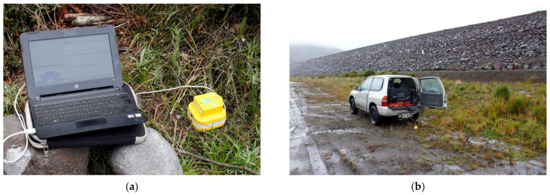 Detailed view of the measurement equipment installed on the ground recording the #4 HVSR station (a). The #8 research point with the equipment measuring and the view of the dam’s downstream side in the image’s background (b).