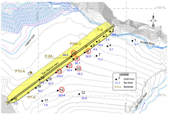 Figure 7 presents a representation map and identification of the susceptible-to-liquefaction points indicated above through a red circle. The points are around or adjacent to the position of the P-8A borehole, located in the central area of the dam. This survey shows where the greatest thickness of superficial granular sediments, related to finer fills, could correspond to investigated drainage paleochannels of the ancient San Marcos lagoon. PSM-3 borehole reached SPT refusal, too shallow (less than 7 m) to be helpful in this investigation [9].