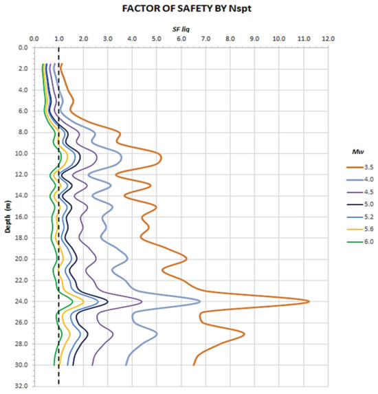 Thus, using Youd and Idrisss Equation (4) [2], the SFliq values presented in Table 4 were graphically represented in Figure 9 for seven different values of earthquake intensity: 3.5, 4.0, 4.5, 5.0, 5.2, 5.6, and 6.0 (it must be taken into account that the scale of the moment is logarithmic, not linear). The extreme values chosen are those that are considered limits: on the one hand, earthquakes lower than 3.5 Mw do not usually produce or induce liquefaction processes [2], while the earthquake of Mw 6.0 is close to the maximum value expected in the area, according to Torres [8] and the Ambraseys relation [38] between Mw and epicentral distance Re (in kilometers) (see Figure 8).