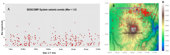 (A) The seismic events measured between 7 November 2016 and 13 February 2017 (SEISCOMP system, events with Mw > 1.0) in the ANGU Cayambe volcano seismic station (modified from [15]). (B) Seismic events near the Cayambe volcano peak from early June 2016 to February 2017. The black lines to the northeast of the figure correspond to the segments of the Chingual fault system, and the San Marcos dam studies area is also indicated (modified from [15]).