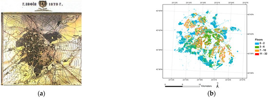 City of Sofia: (a) first urban development plan from 1879 and (b) current building distribution by floor number.