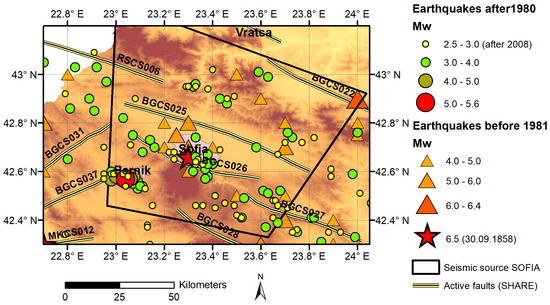 The regional seismicity pattern is concentrated mainly in the upper 10–15 km of the Earth’s crust [10], as illustrated in Figure 3, representing the epicenter map of historical and instrumental (after the introduction of a modern seismic network in Bulgaria) earthquakes in Sofia’s seismogenic zone. This figure also displays the active faults defined in [11].