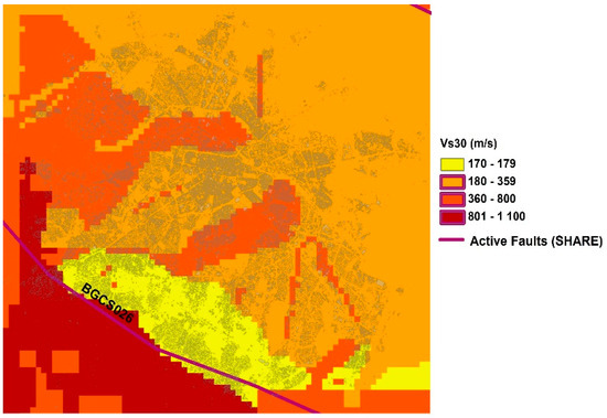 The city’s soil properties were represented through the engineering parameter Vs30—the average shear-wave velocity in the upper 30 m of the soil/rock profile—the values (illustrated in Figure 4) based on the results in [6,12] and supplemented with USGS slope-based global model data (available at https://earthquake.usgs.gov/data/, (accessed on 30 August 2024)) for the city’s built-up area. The figure below illustrates variations in Vs30 values from 170 to 1100 m/s, whereby the highest ones are located around the Vitosha Mountain and the lowest ones are in the southern parts of the city, directly under it.