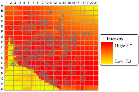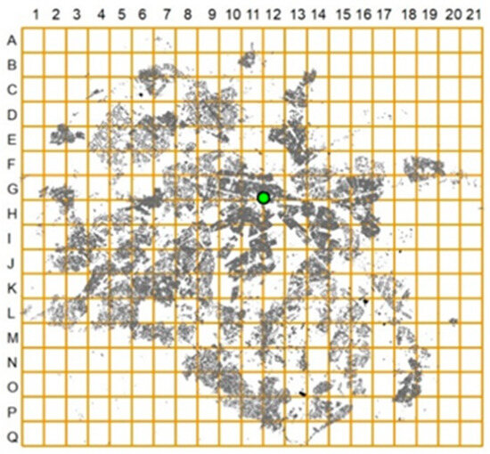 To correctly process Sofia’s building stock input data, a grid (930 m × 1045 m) was imposed, as presented in Figure 6, its dimensions specifically chosen to correspond to that of a geographical map of the city on a scale of 1:19,000 (100 × 70 cm). This was necessary to facilitate building localization and, if necessary, perform specific visual inspections.