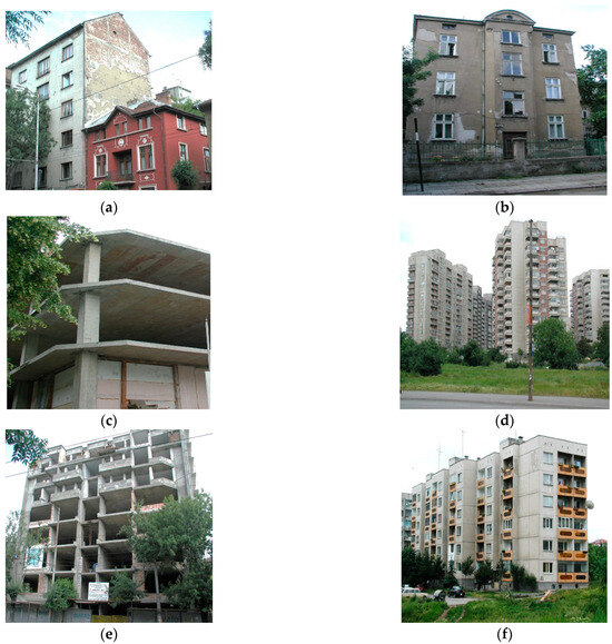 Building typologies in Sofia: (a) five-story masonry building with reinforced concrete belts, type M1; (b) three-story masonry house with wooden beams, type M2; (c) skeletal beamless reinforced concrete structure, type RC2; (d) structures with reinforced concrete shear walls, type RC4; (e) reinforced concrete structure with shear walls and columns, type RC5; and (f) six-story large-panel building, type RCp7.