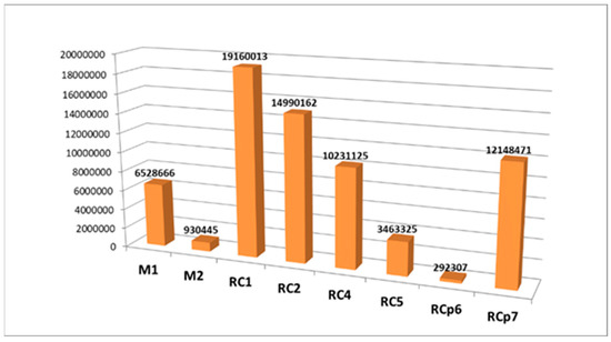 The typological distribution of buildings (total floor area) was quite different, as shown in Figure 8: reinforced concrete structures (RC1) dominated, covering 28.3% of the total area, followed by reinforced concrete structures (RC2, skeletal beamless), occupying 22.1%, and large-panel buildings (RCp7), accounting for 10.3%. The overall area occupied by masonry structures (M1 and M2) only amounted to 13.4% of the total.