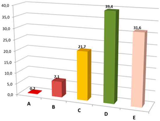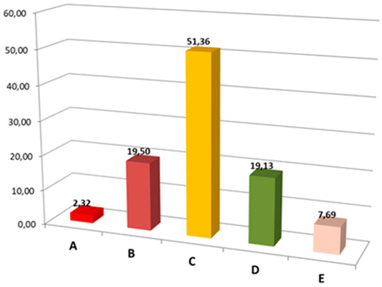 Most buildings fell into class “C”, amounting to 51.3%. In second and third place were class “B” and “D” buildings, totaling 19.5% and 19.1%, respectively. In terms of the total built-up area, class “D” again dominated with 39.4%, followed by class “E”, with 31.6%. The most radical difference is class “C” with 21.7% (at 51.3% by number of buildings).