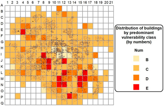 A seismic vulnerability assessment was performed for each building individually, based on information on its load-bearing structure (typology), construction time (design), number of floors, and other technical parameters, assigning each unit a corresponding vulnerability class. The results obtained are illustrated in Figure 9 and Figure 10, displaying the distribution of buildings by number and TFA (total floor area [m2]).