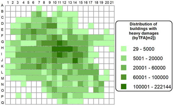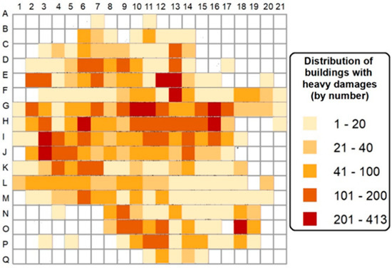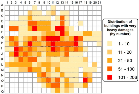The number of completely destroyed buildings is 1835, which is 0.64% of the total built-up area. The most severely damaged buildings (heavy and very heavy damage) cover 7.93% and 3.00% of the total area, with the most significant damage being observed where the oldest low-rise buildings are located.
