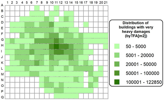 Based on the information collected regarding the building stock and the conducted analysis, we assessed the direct damages and destruction, following the algorithms and criteria detailed in the Methodology Section [24]. The distribution of buildings by number and total floor area (TFA [m2]), split between different damage levels, is summarized in Table 4, where their distribution as a percentage of the total number and built-up area is also shown.