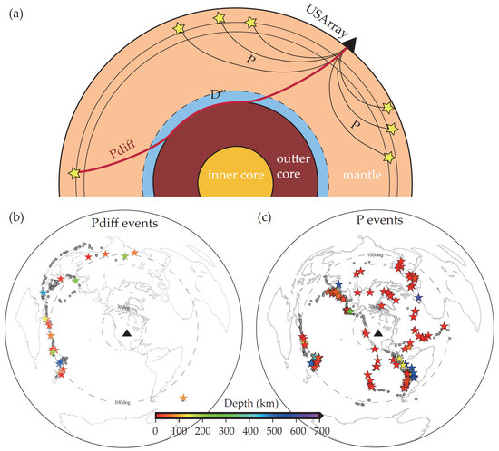Seismic raypths and spatial distribution of earthquakes for direct P–wave and diffracted P–wave. (a) The illustration of raypaths for direct P (black) and diffracted P–waves (red) originating from global events to USArray stations. In (b,c), the maps, centered on (107° W, 47.5° N), illustrate the spatial distribution and depth of earthquakes analyzed in this study. Earthquakes used in this work are marked by stars, with colors representing event depths according to the bottom color scale. Gray dots indicate events that satisfied initial screening criteria but were excluded from further analysis due to not meeting subsequent selection thresholds.