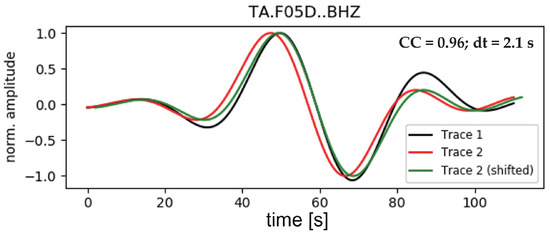 Illustration of the waveform cross–correlation measurement process. The figure displays the comparison between the observed seismic waveform (in black), the synthetic waveform prior to time shifting (in red), and the synthetic waveform following the optimal time shift (in green), highlighting the alignment in travel times. The peak correlation coefficient (CC) value of 0.96, indicative of a high degree of waveform similarity, is achieved at a time shift of 2.1 s, accurately reflecting the travel–time discrepancy between the observed and synthetic waveforms.